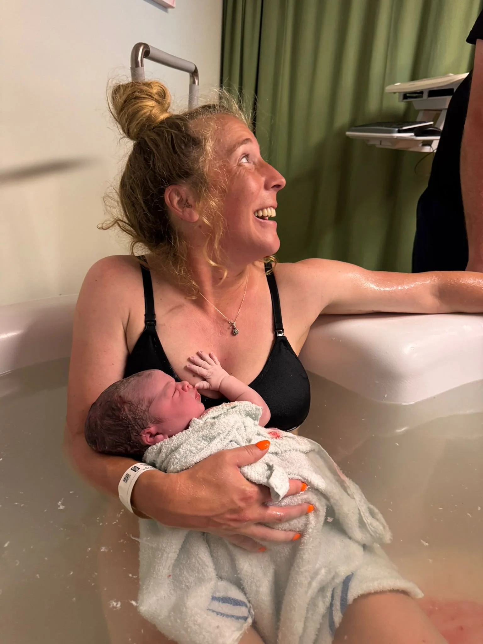 After about a week of off and on cramps (thankfully not at night!), things kicked off in earnest early one morning. Sarah encouraged me to trust my body but offered some positions to try during contractions which we did in the afternoon after feeling like we wanted to encourage baby. These were a game changer! Within a couple of hours we felt ready to go into the Spires and to my surprise I was 9cm when we arrived! My waters broke in the pool and our daughter Rosie arrived not long after.